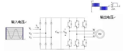 變頻器的基本構造如圖2所示,包括整流電路與逆變電路兩部分。整流電路為普通二極管與濾波電容構成的直流電壓輸出電路,逆變電路將直流電壓變換成脈寬調(diào)制的電壓波形(PWM電壓)。因此,變頻器驅(qū)動電機的電壓波形是脈寬變化的脈沖波形,而不是正弦波電壓波形。用脈沖電壓驅(qū)動電機就是導致電機容易損壞的根本原因。